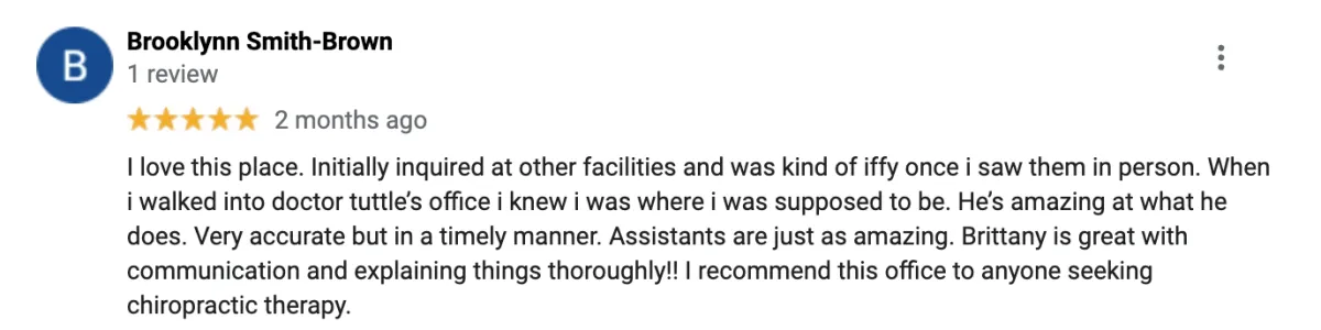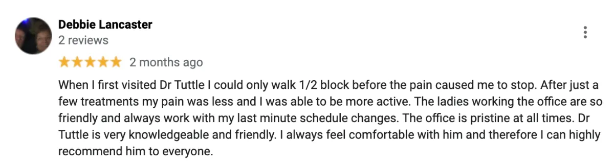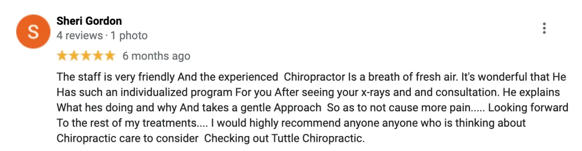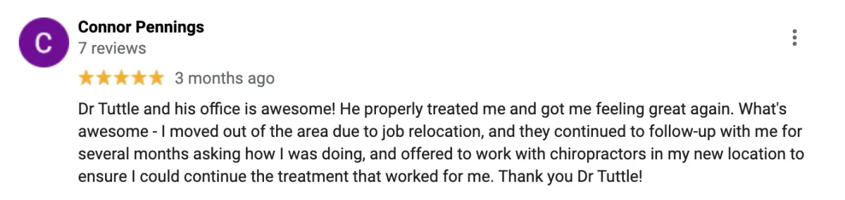 Disclaimer: Procedures and treatments performed by Tuttle Chiropractic have an inherent success (and failure) rate. Reviews, testimonials and content on this site should not be interpreted as a statement of efficacy of procedures and treatments performed by Tuttle Chiropractic for anyone else.